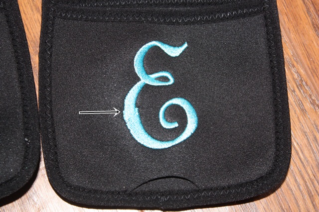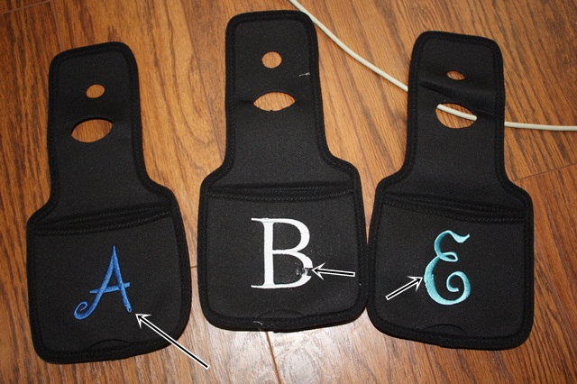 These are Bunk Pockets. I did some of these a couple of weeks ago with NO PROBLEM! This time, I was using the wrong size fast frame (which I figured out after messing up 3), so the machine was getting to a point and then bumping itself out of line. I tried to salvage these and the A & E aren’t too too bad, but I ended up redoing them and have 3 more on order to redo the rest. 🙁 I used the fast frame and you have to go INSIDE the front pocket, so it was tight, but doable with a PR650! I went down 1 size fast frame after messing a few up and it was much much better. BTW, these hang on dorm room bed posts and are great for holding cell phones, Ipods, etc. Graduation gifts!