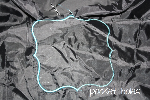 As if messing up 3 dorm pockets wasn’t enough, I tried to monogram this laundry bag at about 11:00 Wednesday night (after I had already goofed on the 3 pockets)! First I tried to monogram the clear pocket. I got the fast frame in there but the pocket was too small for my machine. When I took the fast frame/sticky stabilizer out, the sticky reside stayed behind on the inside of the clear pocket. SOOOOOO….. I thought “I’ll take the pocket off and try to wet it and get rid of the holes and just monogram it“. Nope! The holes would not go away!