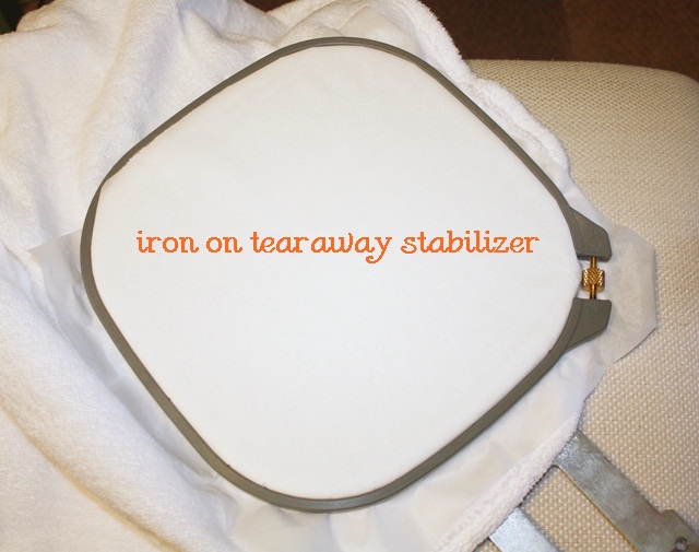 First, I iron on “Iron-on Tearaway” stabilizer. This happens to be Sulky brand, but any will do. I iron it on and it sticks long enough for me to hoop. As you can see on the corners, it doesn’t stick much, which is a good thing when it’s time to remove it.