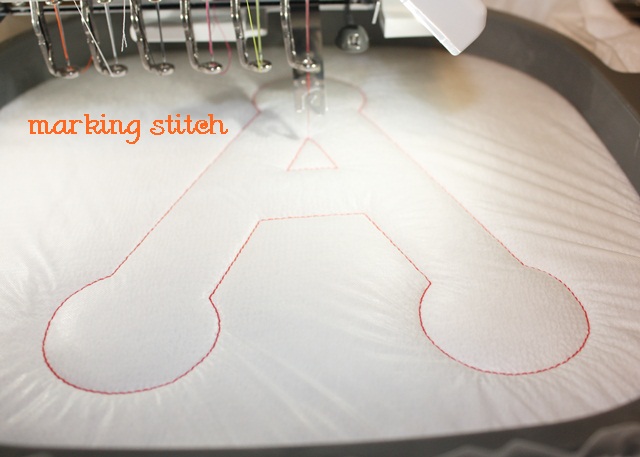 This is actually the corner of a wrap-around towel “sarong”, so I didn’t mark my center. I simply hooped the bottom corner where the applique was to go and started sewing. This is a Dotty “A” from Embroidery-Boutique. This particular A is 5.81″ wide X 6.63″ tall, so it is big. This applique alpha also comes in other finishes (vintage, zig zag and satin). So here I have done step 1, which is the marking stitch. It stitches right on top of the water soluble topper (aka Solvy).