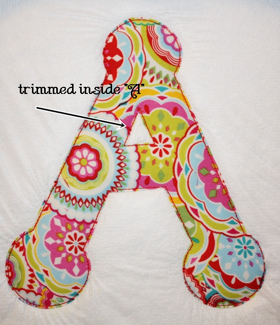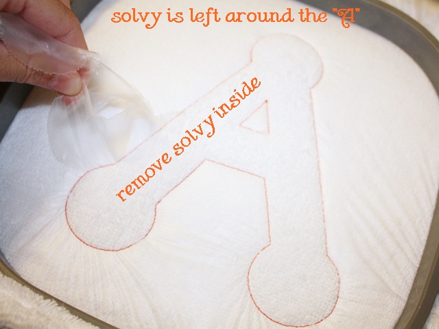 Since I’m doing an applique and using fabric (with Heat N Bond Lite on it), I’m going to remove the water soluble topper INSIDE the A only. That way the fabric with HNBL on it will be flush against the terry towel. This will come in handy when I’m done and am ironing the finished applique A. I started by poking a hole with my scissors and most of the “solvy” was removed by pulling it away inside the stitching. If it won’t pull away so easily, then just trim inside the stitching with your scissors. These are scissors that came with one of my machines.