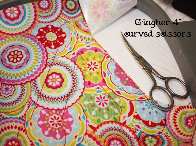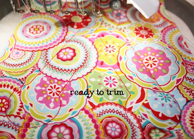 I use Gingher 4″ curved scissors (from Joann). I’ve also heard that Havels work well. I trim closely around the satin stitch. The HNBL helps it to be a “clean cut” as you can see.