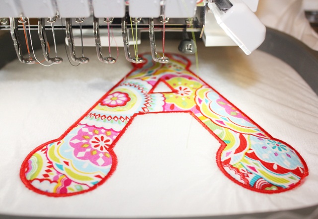 I also removed the little triangle inside the “A”. I am now ready for the satin stitch. You’ll notice the Solvy is still around the applique.