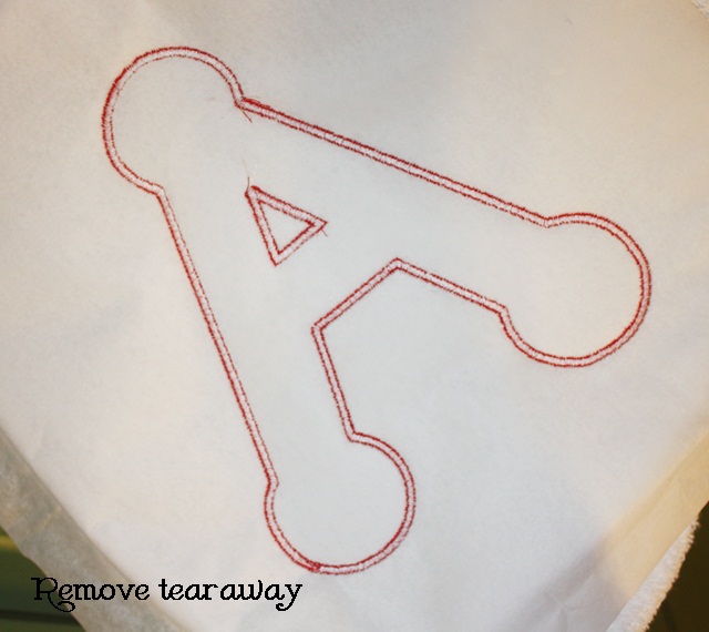 Remove all of the Solvy inside but leave it outside the stitching, which will come in handy when you are doing the satin stitch. If you’ve ever monogrammed a towel with no Solvy on top you may know what I mean (I am guilty!). The satin stitch may or may not sink in to the terry loops. The applique fabric helps, but stick with Solvy too just in case.