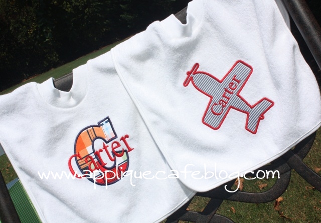 I also did a couple of bibs this morning, with the AC Airplane on one of them. The airplane is one of our very first designs! The C on the left one is from Embroidery-Boutique’s Chunky Alphabet. Font – both Library which is available for MWP users at Needleheads! It’s one of my favorite boy fonts (I also like Tipsy and Atilla – both MWP). Notice the cute fabric on the applique C – it’s Michael Miller and I just got it from TJ’s Fabrics! I love it for boys!