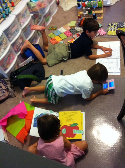 Sorry I have been MIA for a bit. My oldest has started school, but my youngest 2 have.not.started.yet…. I love my kids, but we get up at about 6:40 to get ready to take B to school and I am with them until bedtime at like 8:30. It makes for a long day some days. I “need” that little preschool break and they love it too, so we’re counting down until they start later next week! Factor the summer heat (which I am SO OVER!!!!!!!!!!!!!!!!!) in to the equation and being stuck inside so we don’t melt, or running errands with them in tow (in and out of the car 8 times. did I mention the 100+ degree heat?). You get the picture! 🙂 This was the scene yesterday as I tried to work on a couple of items (to help pay for all the bedding and “decor” for Mallory’s room I’m having made). My sewing room ain’t that big. 4 seconds after this photo were “I’m doing homework and they are being too loud!!!!”, “Mom she is ripping my book!!!!”, etc etc etc. Love them!!