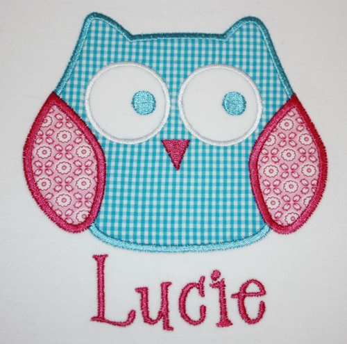 I’ve had 4 e-mails today about the JUST BLANKS shirts I mentioned in yesterday’s post. I thought I said that I had a sample (the owl) available, but I guess it sounded more like “I have a box of Just Blank tees to sell”. As I replied to the e-mails, I really haven’t decided what to do with them yet. I bought them from a clothing line that was not going to use Just Blanks anymore. It was one of those ‘friend of a friend hook-up deals’ so I took advantage. At some point I will get the box out and take inventory and THEN decide if I have any to spare!? I honestly don’t know what all is in the box, what sizes, or what style (I think she sent short and long sleeved tees). Anyway… I DO have this sample Owl shirt in a size 4/5. The tag says “shrinkage is expected” but the shirt appears to be a good 5 to me? Here is a closeup of the OWL, which is not available yet on www.appliquecafe.com! This is a brand new design that will be listed possibly tonight.
