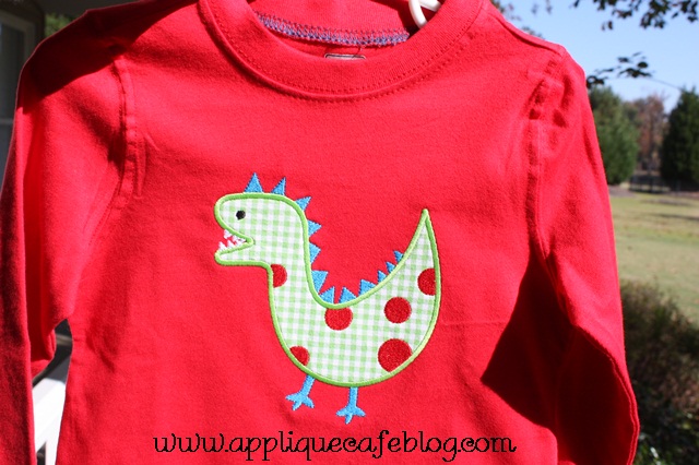On this J. Khaki shirt, I did Embroidery-Boutique’s Raggy Flower design, which is a favorite! On the raggy designs I use a layer of white flannel underneath my fabric. You can also use colored flannel or a couple of extra layers of fabric underneath – white or gingham that coordinates. This fabric is an all time favorite – it’s from Hobby Lobby. Check out Helpful Posts for more info on Raggy designs.