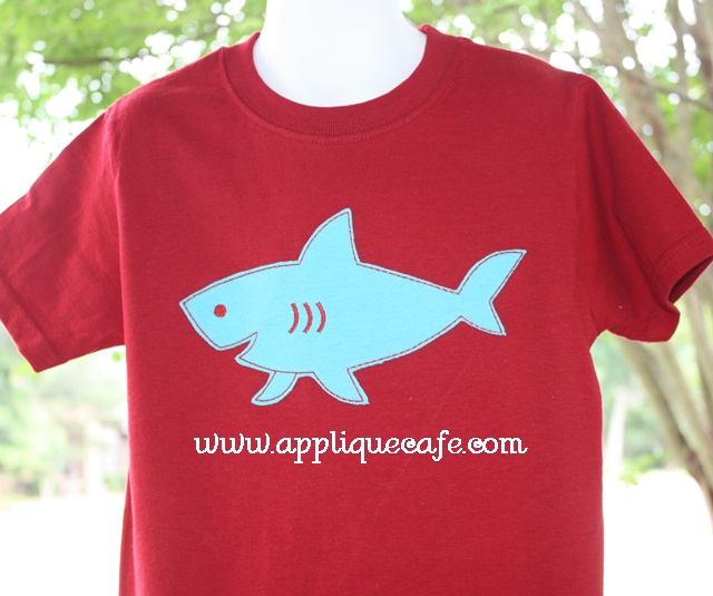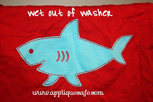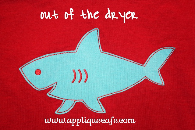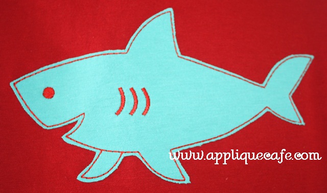 I sewed the mini embroidery shark (2 sizes) on 1) fabric and iron on tearaway stabilizer (thin paper-like stabilizer) and also on 2) fabric and medium cutaway stabilizer. As you can see below, the iron on tearaway shark outline appears “off”, when above the outline is more on top of the outer edges of the design. This is because a) the stabilizer is not enough to support the thin fabric and 3,000+ stitches (on the larger shark). You have over 3,000 stitches in a span of a few inches. It’s going to gather your fabric just enough that the outline does not match up exactly! Even on the smaller shark, you have 1400 stitches in a span of about an inch and 1/2.