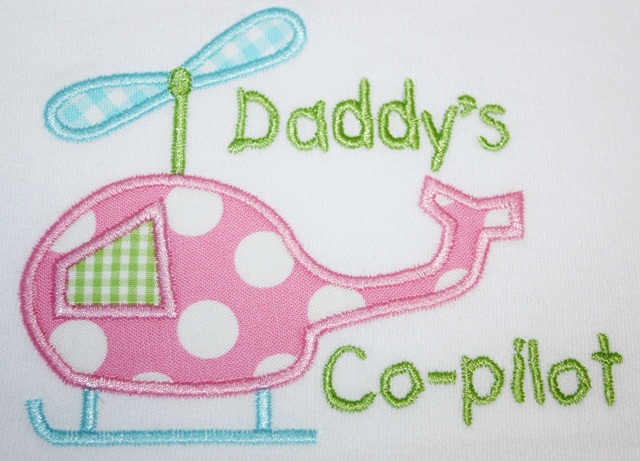 Helicopter ~ I like the colors, but also love the Daddy’s Co-pilot! This was on an infant onesie. I wonder if the dad will melt when he sees his little girl in this?