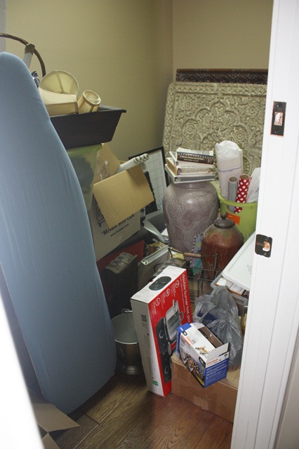 And when you walk in our new front door and take an immediate right, you find our lovely office/sewing room. Not much has changed and I.am.frustrated. I have not been able to commit to hanging anything yet (which also goes for the rest of the house). Love my Expedit cubby and need more baskets. I need to hang my thread, my clock, my stabilizer rack, anything and everything else… We have hung my bulletin board and the TV. That’s it.