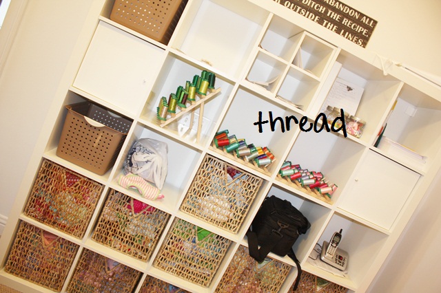 Thread stands…. not where they should be! The baskets do house my fabrics and they are organized still in to categories: colors w/ white polka dots (big dots), multi colored dots, pin dots, fat ginghams, regular ginghams, microchecks, boy fabrics, girl fabrics, etc etc etc. I know which basket has which fabric in it and I can also see through the triangle handle.