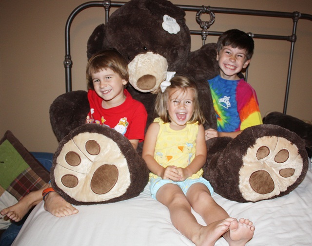 Friday after VBS I decided to take the kids to Costco for lunch (where else can you feed 4 people for $7?). The kids quickly spotted this gigantic stuffed Bear (after we ate and decided to meander through the store in search of dessert ~ aka some sort of sweet sample). Price tag was $30 and I convinced Browder that I was NOT buying this huge bear, and he quickly asked if we could come back to Costco later so he could get his own money and pay for it. I agreed, and Friday evening we did indeed go back to Costco and purchased “the Bear” now known as Chocolate. Do you see the pure joy on all 3 faces?? While Browder paid for the bear, he had to agree to share it with the other 2, as our summer home just isn’t big enough for 3 of these! LOVE the big feet!!