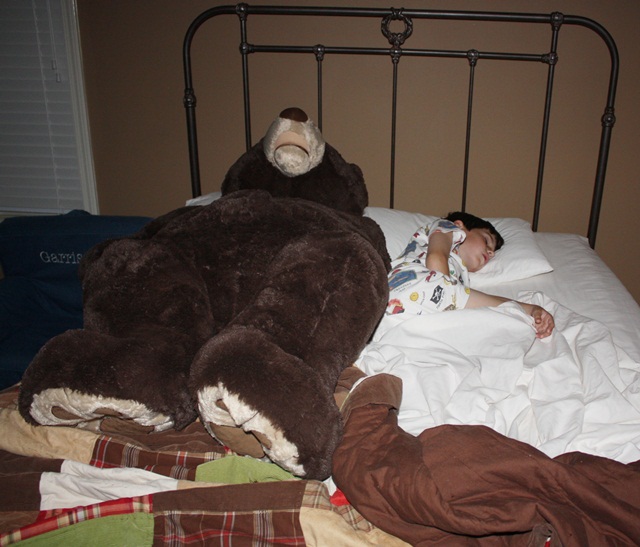 Back to Chocolate, this was the scene Friday night and I could barely take this picture I was laughing so hard! Where is G? you might ask. G is on the floor on a sleeping bag. Chocolate appears to be snoring and is 6 times as big as Browder! Other than the few squabbles because the little ones were slobbering a little on Chocolate, this bear has been highly entertaining and well worth the 30 bucks (out of Browder’s pocket)!!