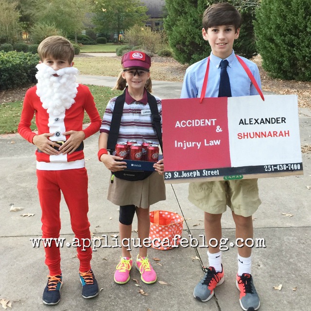 The 13 year old. This was our Sunday afternoon painting-in-the-driveway project. If you live in the Southeast, then you know who Alexander Shunnarah is or have seen a billboard or two (or 380). He wanted to dress normal and be a “bottle flipper”, but one day while driving to work last week I saw a billboard and decided this would be much funnier. His costume was a hit in the neighborhood and on Facebook! Plus it only cost me about $13 in alphabet stickers.