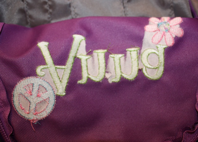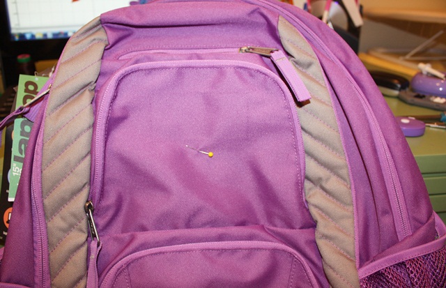 This, my friends, is a backpack (duh). You may be able to tell that my friend who sent this to me to monogram took the tag off (right above my straight pin). Her daughter is going in to 4th grade (I think??) so she said do her name, and that she’s in to peace signs! Sounds like a call for MINI DESIGNS! First I pinned my center of the top part of the front pocket (flap, we’ll call it).