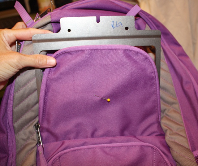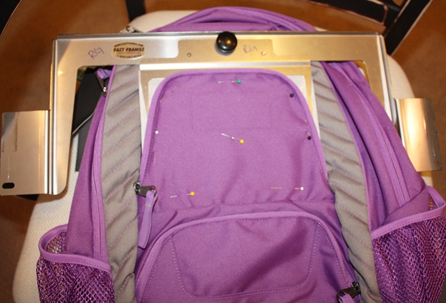 I then “stick” the backpack flap to the sticky paper on my fast frame. I usually line the top of the flap up with the top of the frame and then pin it in place with straight pins. This also shows me my borders. Since multi needle machines don’t technically recognize fast frames, you have to check the outer border of your design to make sure the needle won’t hit the edges of your frame.