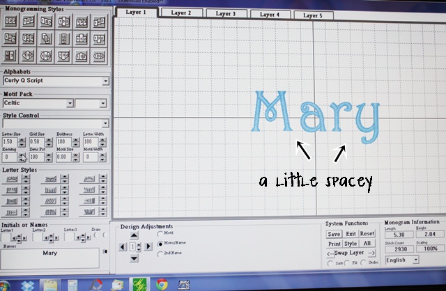 I got my name together merged with a couple of cute mini designs. The peace sign is from Embroidery-Boutique and the Flower is from Applique Momma (it also has a peace sign in the middle). I used Monogram Wizard Plus Specs font. I love the font and it’s great for initials, but names are tricky. It spaces out rather strangely. I will explain all that in my next MWP post this week, but in the meantime you can see that I layered this name together IN Monogram Wizard Plus so that it all lined up and/or was spaced correctly. Layer 1 – A, Layer 2 – nn, Layer 3 – a. I then saved it and merged it in to my Sew What Pro. I added the mini designs, centered the whole thing and then saved it to my machine. I saved this in a 5×7 hoop space but will use my Fast Frames.
