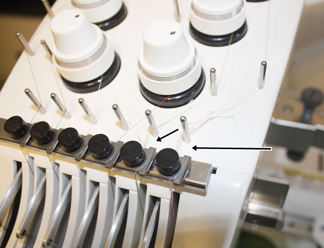 Now you just un-thread those needles (the ones you are changing thread colors on) and pull the old thread (from way down by the needle). Pulling the old thread will also pull and guide the new thread through all of the holes, around the tension knobs and guides, etc. since they are tied together.