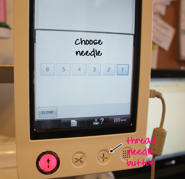 This photo is blurry, but there is a guide (see next photo) that you wrap the thread around, and then you wrap the thread up and to the right around the white button with the curved arrow on it (below). This will also cut the excess thread off (including the previous color thread hanging down). You then press the THREAD NEEDLE BUTTON (see ABOVE photo) and it will thread your needle. Then you would select needle 3 and your machine will move needle 3 over making it the center needle. Same process ~ wrap the thread around the guide, then up and around the white button which will cut the excess thread off. Then press the thread needle button again.
