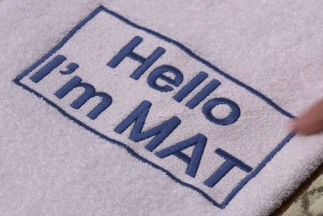 Deborah also goes over using “background frames” when monogramming towels, bath mats, bibs and other fluffy items. Background frames are light density fill stitch frames used behind a monogram. They are hardly noticeable and look like part of the design when finished, and really make the monogram *POP*. There are a few frames included in the cost of her class. Here is an example she showed and this is a bath mat. You don’t use a top stabilizer when using a background frame, and use a color thread that “goes” with the item you are monogramming. On this white bath mat she used white thread for the background frame, and it makes the terrycloth lie down, which is the goal. It really makes the monogram stand out!