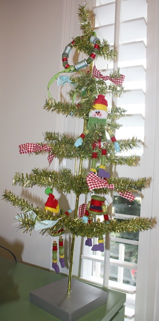 Next we have my SEWING TREE! I saw a similar tree on a blog a year or two ago and I finally broke down and bought a little tree from Hobby Lobby (50% off no doubt). I only have a few ornaments (it is hard to find sewing related ornaments – I looked at Joann, Michaels and Hobby Lobby with no luck this year). I cut up some fabric and tied that one. It’s pretty cute in person and I hope to add to my ornament collection. I think these came from Joann, but I saw none this year.