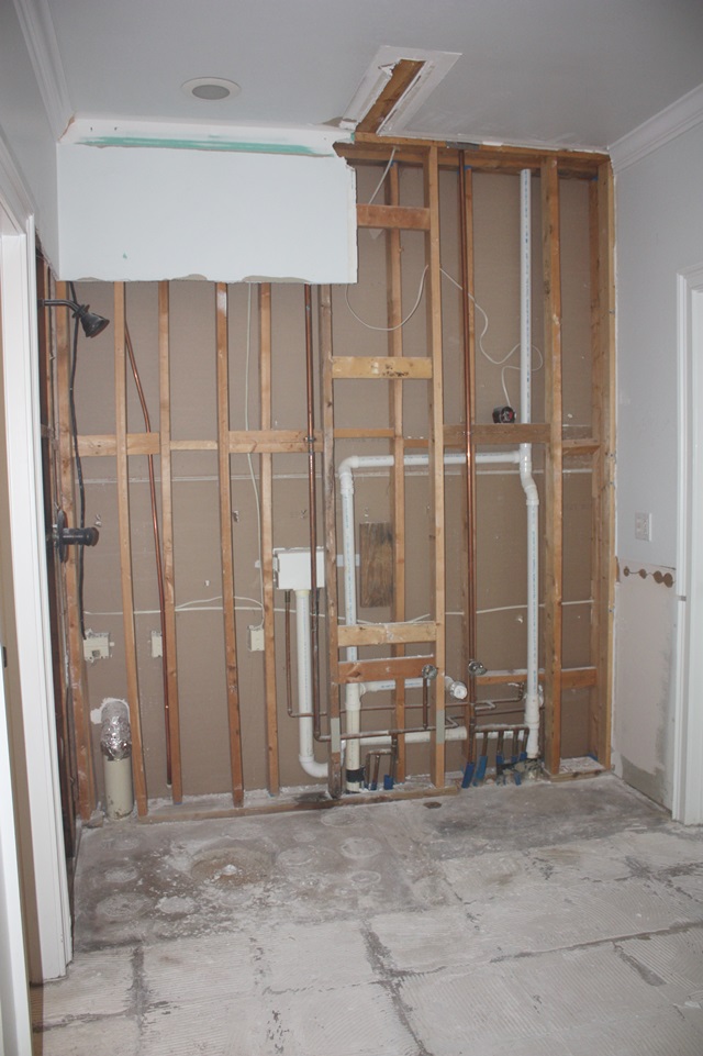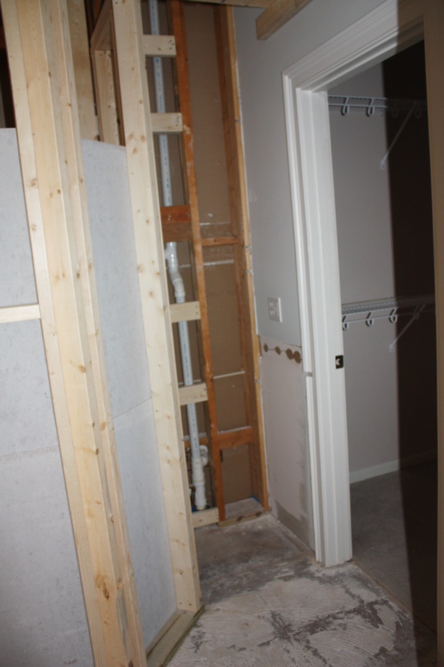 Here is our vanity area again. It’s amazing that they can take THIS and make it in to something beautiful! We now have some cabinets in place and the counter top SHOULD go in tomorrow.