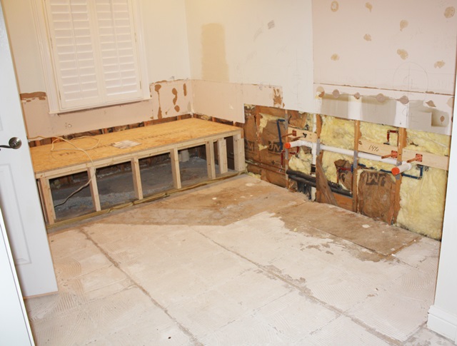 I have more reno photos to share! If you aren’t interested in bathroom before and afters, then go ahead and jump on over to Facebook! We are getting closer. These pics were taken since my last post but we have come a long way since these. I will update more soon! It has been fun, exhausting, stressful, time consuming, etc. but I know it’ll all be worth it when it’s all done. If I sound like I am complaining about redoing my bathroom, I AM NOT! 🙂 It’s just a process and it’s not all fun! I thrive on a clean, organized house. A renovation and having people in and out all day every day is rockin my world! 🙂