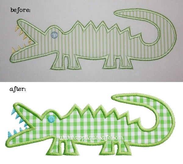 We also sell some of our designs at SWAK Embroidery and also on Etsy. Here’s a prime example of a design that we were getting ready to list on Etsy. Our Alligator design is one of our originals (#60 out of 575) and I shrieked a little when I saw this picture! The fabrics are cute enough, but I think I must have taken this picture in a closet somewhere! So…. this morning I re-did the sample with a brighter chunky lime gingham with turquoise teeth and eye. I also got a brighter picture (outside even tho it’s dreary here) and removed the background in my photo. It looks MUCH better, eh? One design at a time…… A good photo and fabric can make ALL the difference!