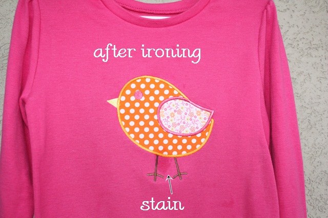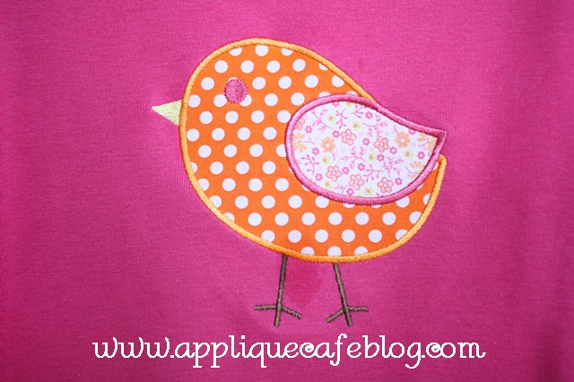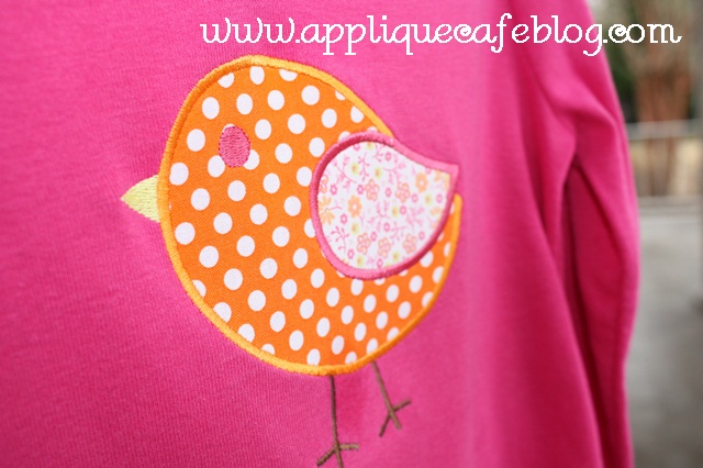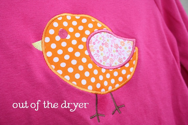 I ran an iron over the shirt a time or two, and this is how it looks. There is a “wet spot” between little birdie’s legs, which is probably a stain of grease or cheese dip or something. Sissy is 4 so most of her shirts have something on them!