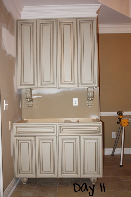 Here is the buffet area again ~ molding has since been added and this will have granite counter tops as well. You may notice the door 2nd from the right coloring is a little “off”. It is, and will have to be replaced. The right drawer is actually off too. I’m excited about this piece and am already thinking of commissioning AMR Art to paint something for the space between the counter and the top cabinet!