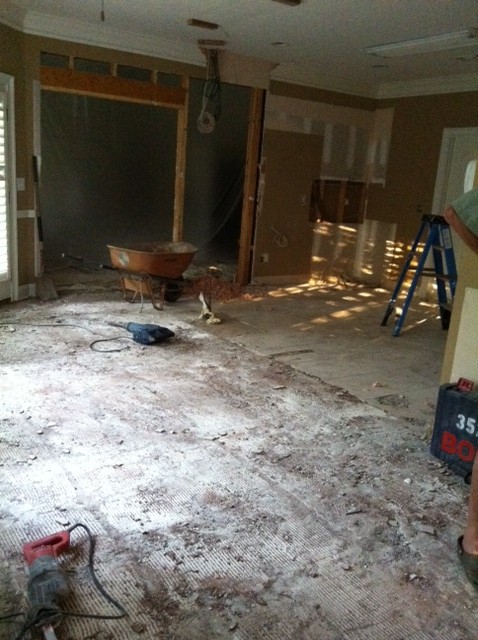 I had a couple of people ask who did our cabinets. I happen to have a connection! Jeff works for Bishop Cabinets during the day (and Applique Cafe at night). So that’s where they came from, but we used Adams Interiors to figure it all out and help us “design” the kitchen, and a guy named Aaron Corbin did our tile, cut out the wall to the den and 1,891 other things we asked him to do. We’ve been super duper pleased with everyone involved! Like I said, now we wait for the counters, then backsplash, painting (picking out paint colors now) and we still lack some molding and our drawer pulls. We also redid Sissy’s cabinet and are redoing the other guest bath cabinets, so I’ll post pics of those later too.
