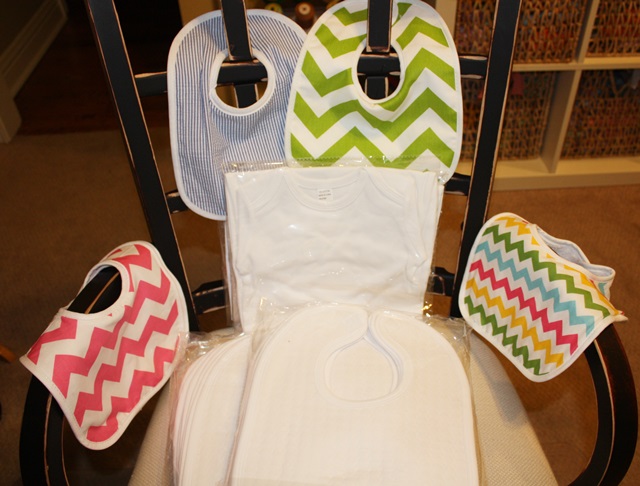 Here are a few goodies I came home with. Several cute bibs, plus I stocked up on the white quilted “Oriental Products & Trading Co” bibs and their white infant gowns. I like to keep a few baby gifts on hand. I have to say, the “blanks” booths at the temporaries were all PACKED!! Tons of chevron bags and all that stuff you can monogram.