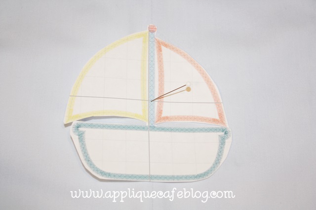 Gridlines also printed on my design, so I was able to get the sailboat in good position and stick a pin through where my center should be. I then lifted the paper away and marked my center using an air erasable marker. You can see the mark on my first photo above. I hooped the jon jon and lined my needle up with the center mark and sewed the design. (As you can see below, my pin is slightly right of the center mark on the grid. I wanted the center seam of the jon jon to line up with the center of the pole of the sailboat so I lined it up that way.)