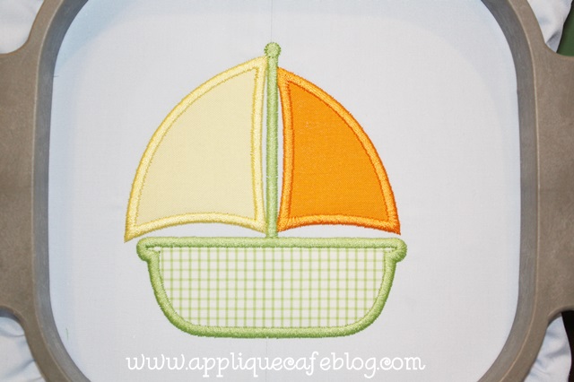 I decided to give our Sailboat 2 a try, and to make sure it would cover the monogram, I printed the 4×4 design on paper in Sew What Pro using the PRINT feature. It basically prints an image of each step and a final stitchout of the design. I cut around the design and even in between the sails and the bottom of the boat. I was then able to place the “design” on to the jon jon and SEE if any of the old monogram would show through. It covered it pretty well, and I got the design in the right position to cover up the monogram while being centered on the jon jon. The jon jon had a center seam going down the front of it, so I used that as my horizontal center.