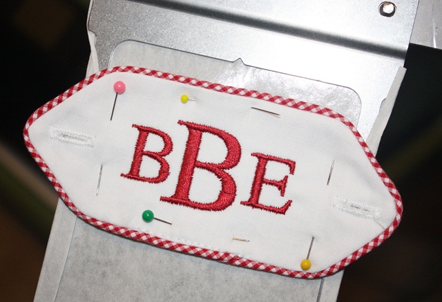 I’ve monogrammed a few of these “tabs” lately so I thought I’d take a picture. I use STICKY STABILIZER to do these and as you can obviously see I pin the tab in place (after I’ve marked my center starting point on the tab which you can’t see). I’m using FAST FRAMES for my 6 needle machine, but the same concept applies for any machine ~ hoop a piece of sticky stabilizer and pin the tab in place. This would also apply to RIBBON and anything you can’t hoop! I guess you COULD hoop ribbon, but this method is much easier. Once you’re done just peel the sticky away.