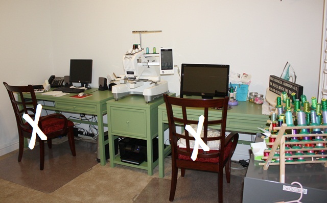 And here is our office/sewing room tonight (below)! We’re missing a drawer on the left desk ~ awaiting a replacement part from Home Decorators. This is from the Martha Stewart Craft Collection and it’s very heavy and sturdy and I’m really excited about where this is going! You’ll see our old dining room chairs which we will eventually replace with maybe this? We need to go do a test sit and see….