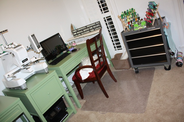 Looks awesome! I have pics of my room makeover from a month or so ago & pics of pegboards that a friend helped me with. They still need paint, but check them out. We hung my spool-holders on the pegboards to free up table space. She’s a brainiac wen it comes to organization! (www.thesassycloset.blogspot.com). LOVE your color scheme! The green is my favorite!