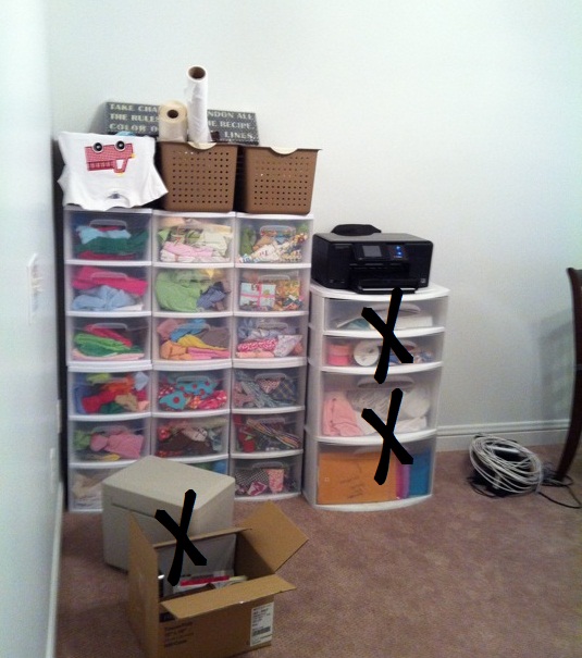 Anyway, it’s a START! I’m seeing a color pattern ~ white, black & green. My fabric is still in the other corner in the stacked plastic bins/drawers. I’d like to find a cuter solution to that and have had my eye on several things including cubbies, or some type of something (furniture) with drawers on the bottom and shelves. This was a moving in photo ~ I got rid of the plastic drawers on the right, the printer and the other stuff on the floor.
