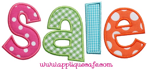 Today is the last day for our 50% off sale ~ www.appliquecafe.com. I’ve seen a lot of fall designs come through the carts. As hot as it is, I know it’ll be football season before we know it! The font I used for SALE is Cheri from Jolsonsdesigns.com. I hope Jolsons has sold several of these alphabets because I have had a ton of people ask me what it was! We do not sell any fonts at this time, so most of the ones I use are like this one from Jolsons and I also have several from Embroidery Boutique!