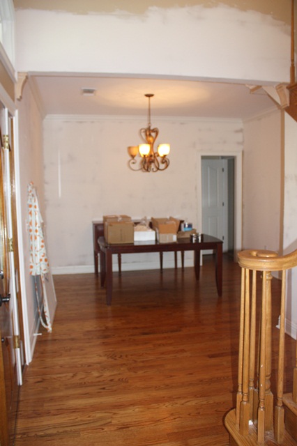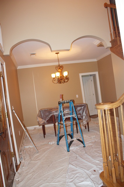 We are still in renovation mode. The kitchen is about done (are you sick of hearing about it yet?) ~ we have one more good day to wrap up loose ends, hang lights, hook up plumbing in a couple of sinks, etc. Hopefully that day will happen this week. Last week they took this funky arch out of the foyer. We’ve been trying to figure out it’s use ever since we moved in. Also, we’re painting the dining room so the walls had to be mudded first. The existing paint was drippy, hence the mud. The mud walls will be sanded first and then painted.