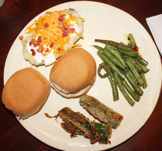 Oh, and I baked the organic potatoes. Here is a photo of my plate. The buns were Pork Tenderloin sliders I had purchased from a friend who has just started doing a little pick-up-meal business. Impressed? Don’t be. It was yummy though! My kids were THRILLED (NOT!!) with this meal!