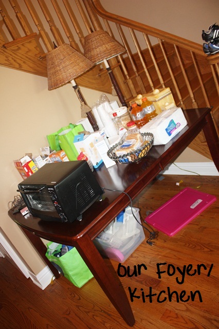 So now the big story… tomorrow is DEMOLITION day! They are removing all of our kitchen, eating area and laundry room cabinets and the tile from our kitchen, eating area, pantry and laundry room. They will then lay tile again and then put new cabinets and countertops in. This process should take a couple of weeks. I’m super excited, but also super nervous about the amount of dust I’m going to be cleaning and inhaling. Did I mention they are tearing out part of a wall? There are also some funky arches in our foyer we hope to remove. Anywho… we’ve cleared out the kitchen completely and our kitchen is now located in our foyer and dining room. Our den furniture is in our bedroom (which I forgot to take a picture of)!