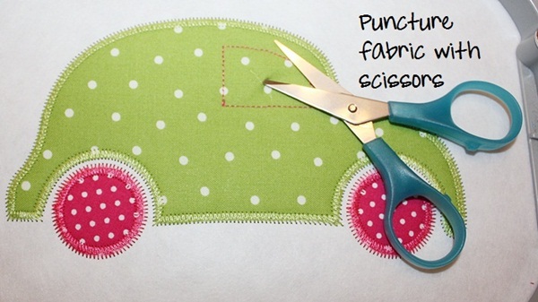 As you can see below, I’m using some blue handled embroidery scissors that came with my machine. They are dull as can be, but I still use them for steps such as this! With the scissors at an angle I just puncture through the fabric, then trim inside that marking stitch. I usually use my 4″ curved Gingher embroidery scissors for trimming.