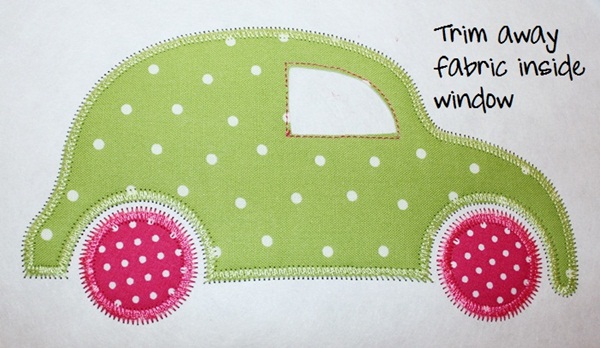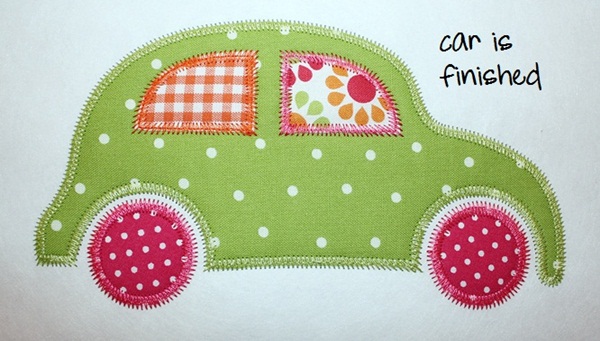 First… as you can see I’ve already sewn the marking, tackdown & zig zag stitches for the body of the car (step 1, 2 and 3) and for the tires (step 4, 5 and 6). This would be step 7 in my applique process for this design. It sewed the marking stitch for the right window.