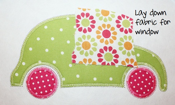 I’m now ready to lay my window fabric down (which has Heat N Bond Lite on it) for the right window tackdown stitch (step 8). The whole reason for this post… you COULD layer the floral fabric on top of the green polka dot car fabric, which is totally fine if that’s what you want to do. However, if your bottom fabric is darker than your top fabric, and you think the bottom fabric might show through, then follow these steps so that now the only fabric under your floral window is white shirt! Are you following me?