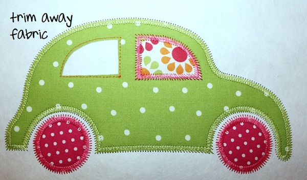 I took these pictures the other day as I sampled the Applique Cafe (not listed yet) zig zag VW car. I did a post once before on layering fabrics in an applique, but this is a better post on what to do when your applique has *layers*. It’s not NECESSARY for you to do yours this way, but it’s the way I do it so I wanted to share!