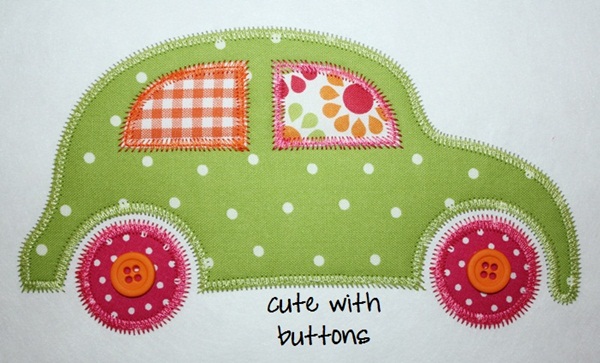 My kids had so much fun with my bag-o-buttons! Here I laid down 2 orange buttons in the tires and it adds a ton to the design! I would have sewn the buttons on by hand had this been an actual sample shirt.