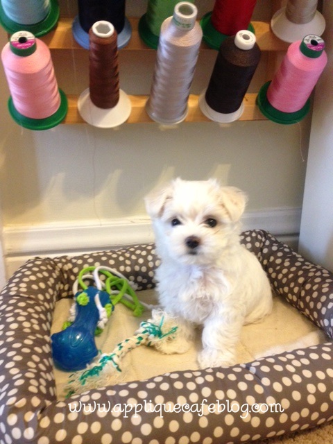 I love your blog! And refer to it often for tips on monogramming and supplies…and the dog pics are so cute! We had a dog that would hang out in my sewing room all the time…I loved it. Even if you would post pictures of things you are working on it would be great!