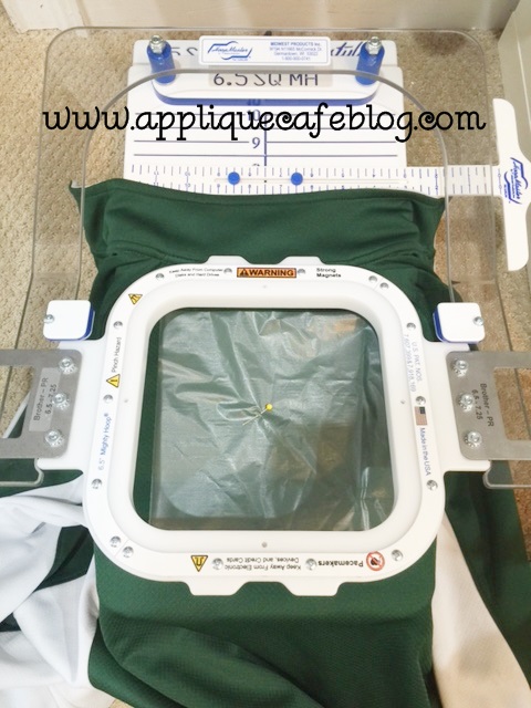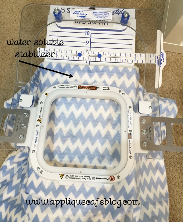 I marked my center of the blanket which was about 6.5″ from the bottom. The lines on the fixture count up from -0-, which is the center of the hoop. If I want my monogram centered 6.5″ from the bottom, I line the end of the blanket up with the 6.5″ line on the fixture. I also lay a piece of water soluble stabilizer on top of the blanket because it’s a minky material and I don’t want my monogram thread to sink in to the blanket. Note: the clear part on top bounces up and down, and is used for the top part of my hoop. Note 2: I did not use the T-bar for this particular blanket, but will show a photo later of when I did use it on a hand towel.